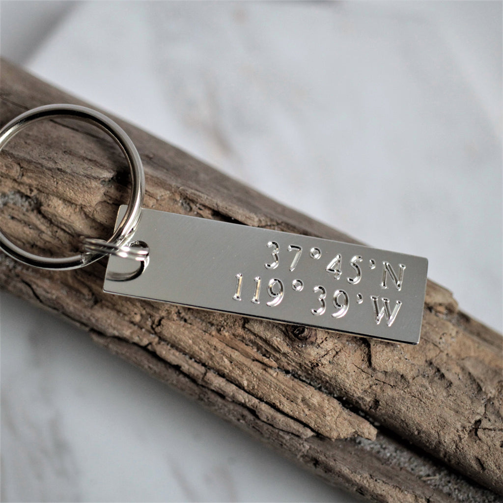 Engraved Longitude and Latitude Sterling Silver Key Chain