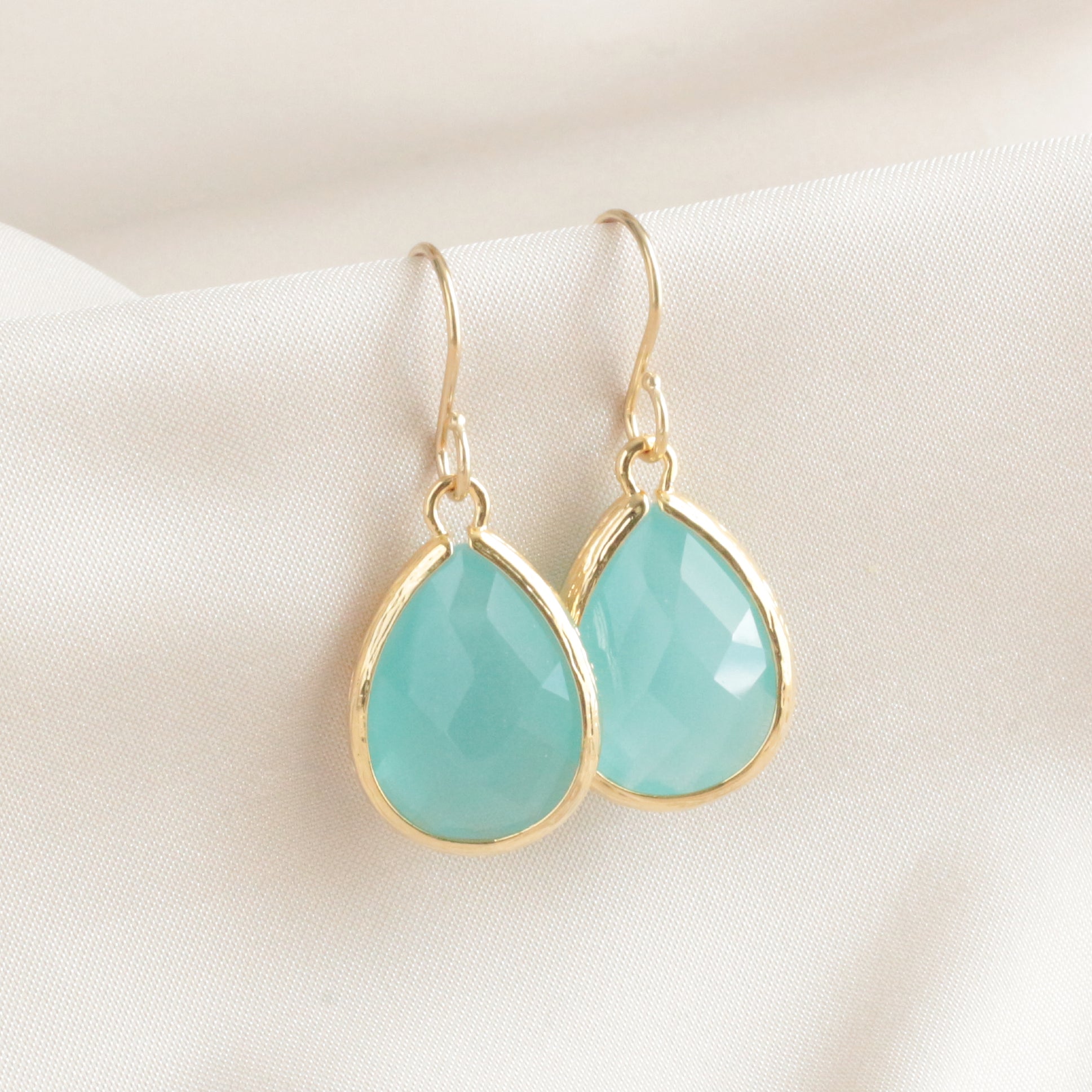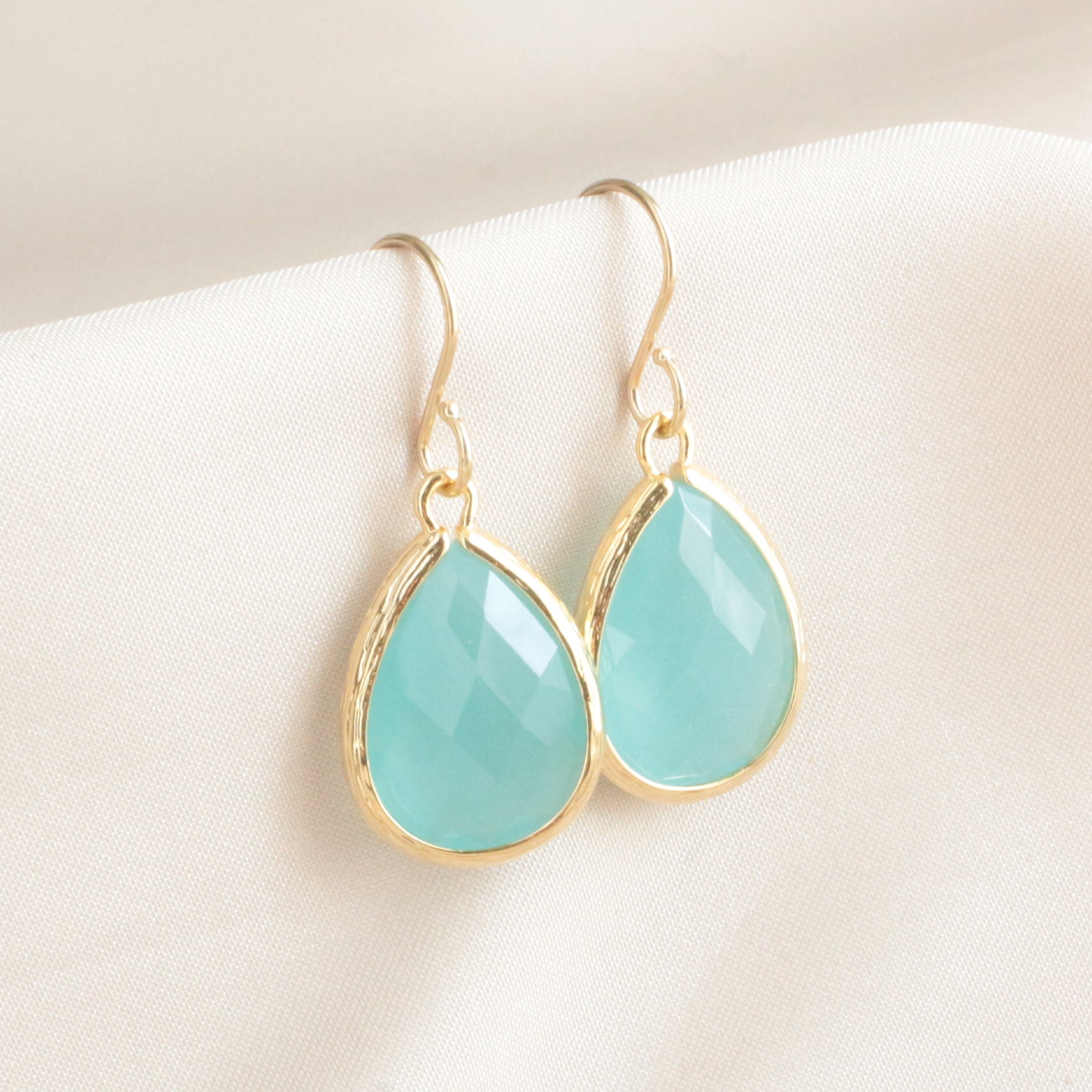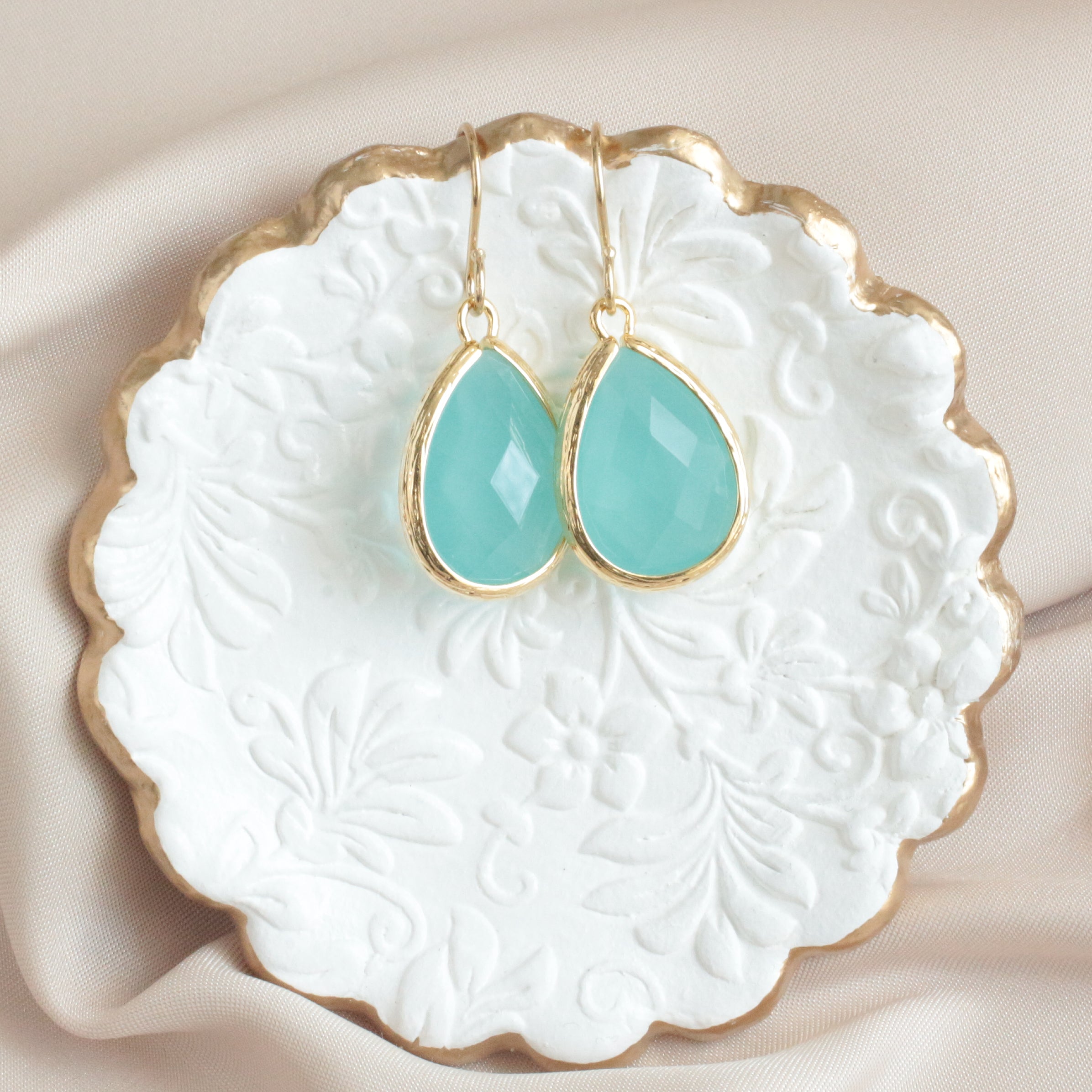 · Rhodium gold plated soft, subtle mint faceted teardrop in a prong setting and finished with a gold-filled ear wire measuring 1 1/4".